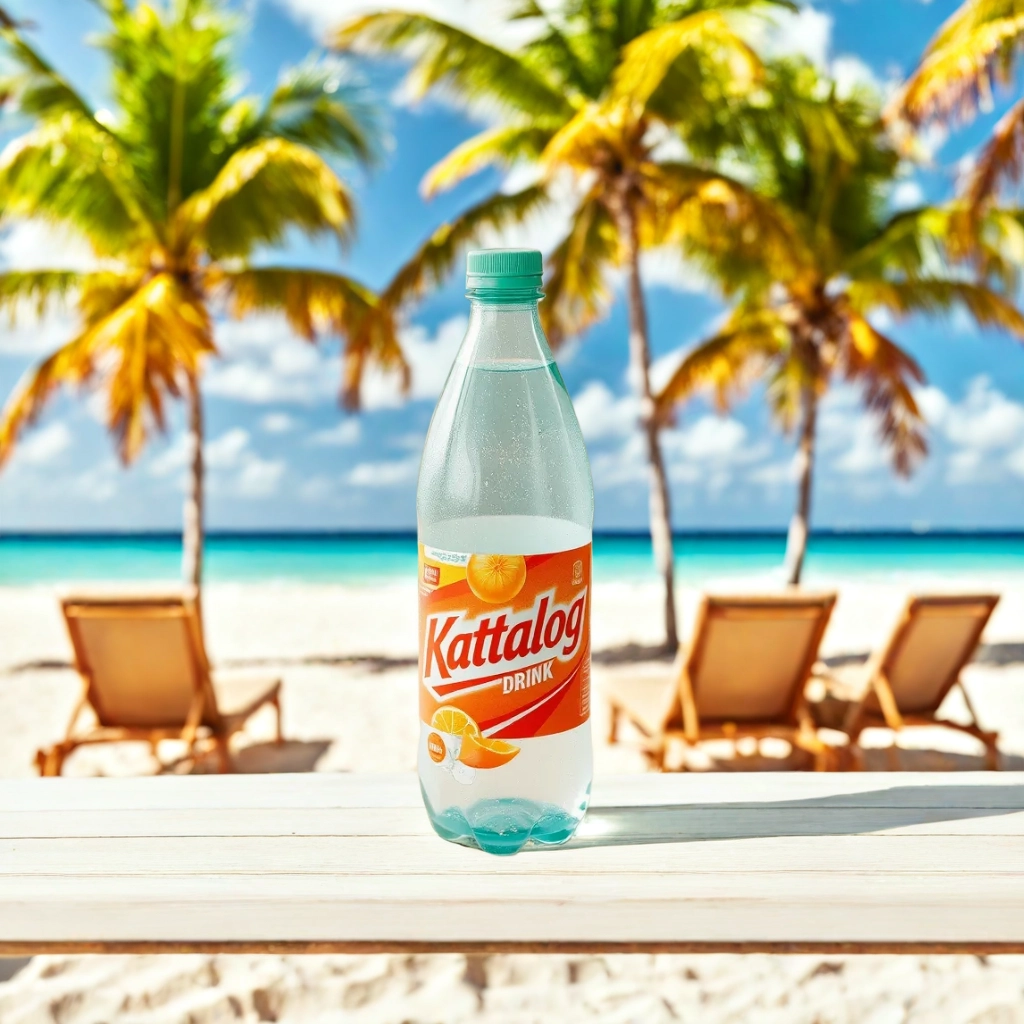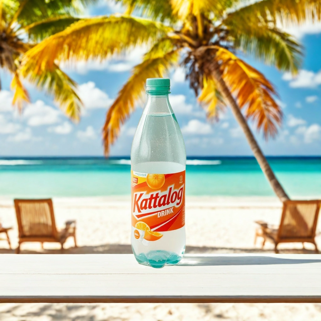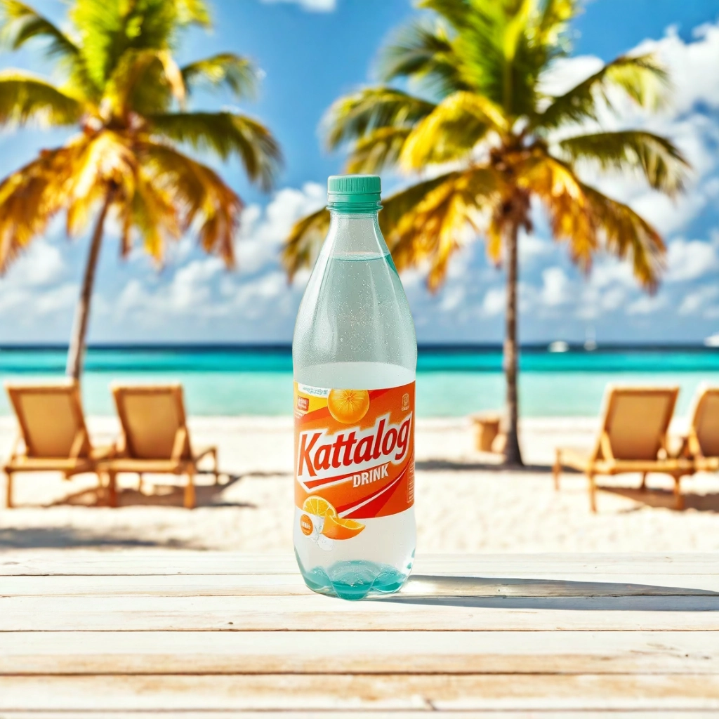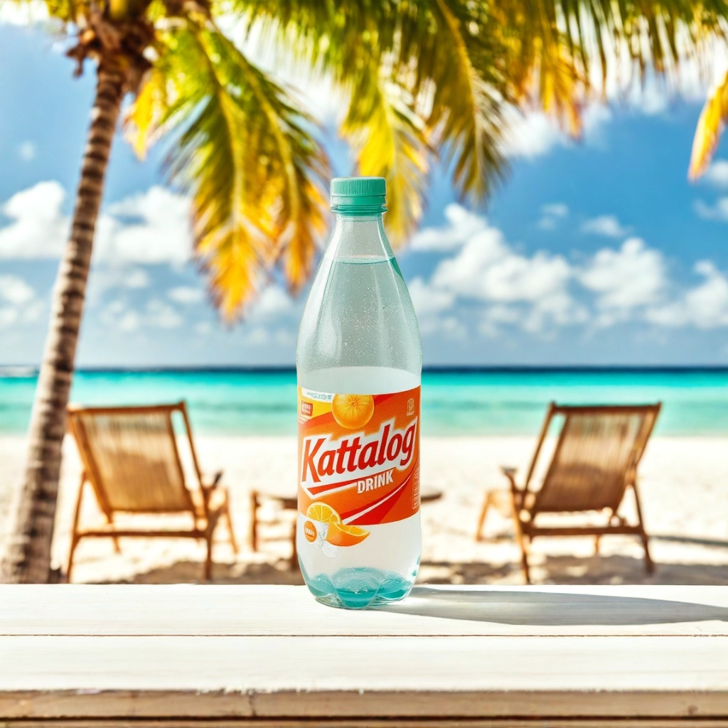 Kattalog Drink on Table with Beach, Tropical Island background. AI product photography examples generated by Kattalog AI.