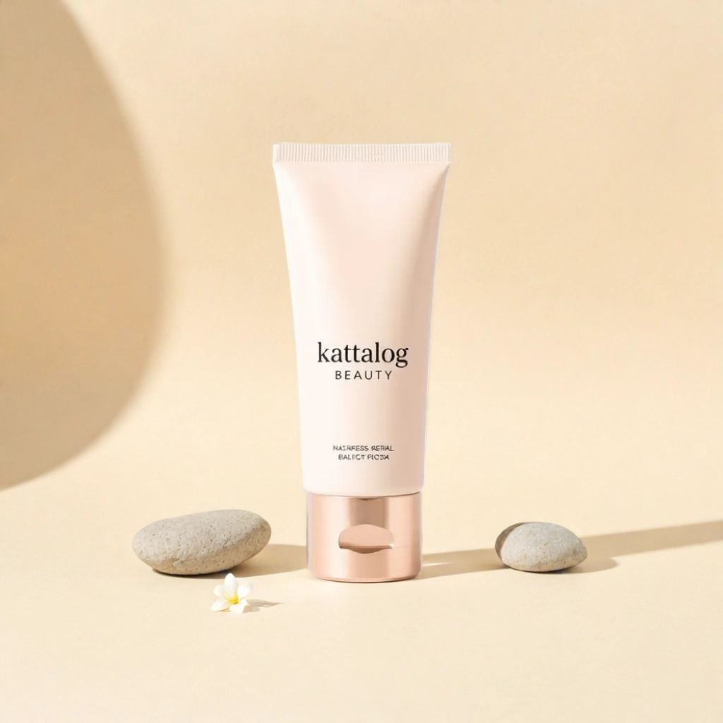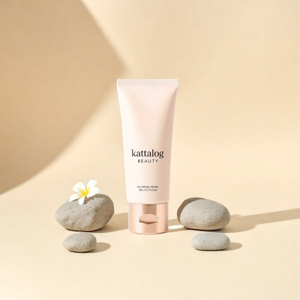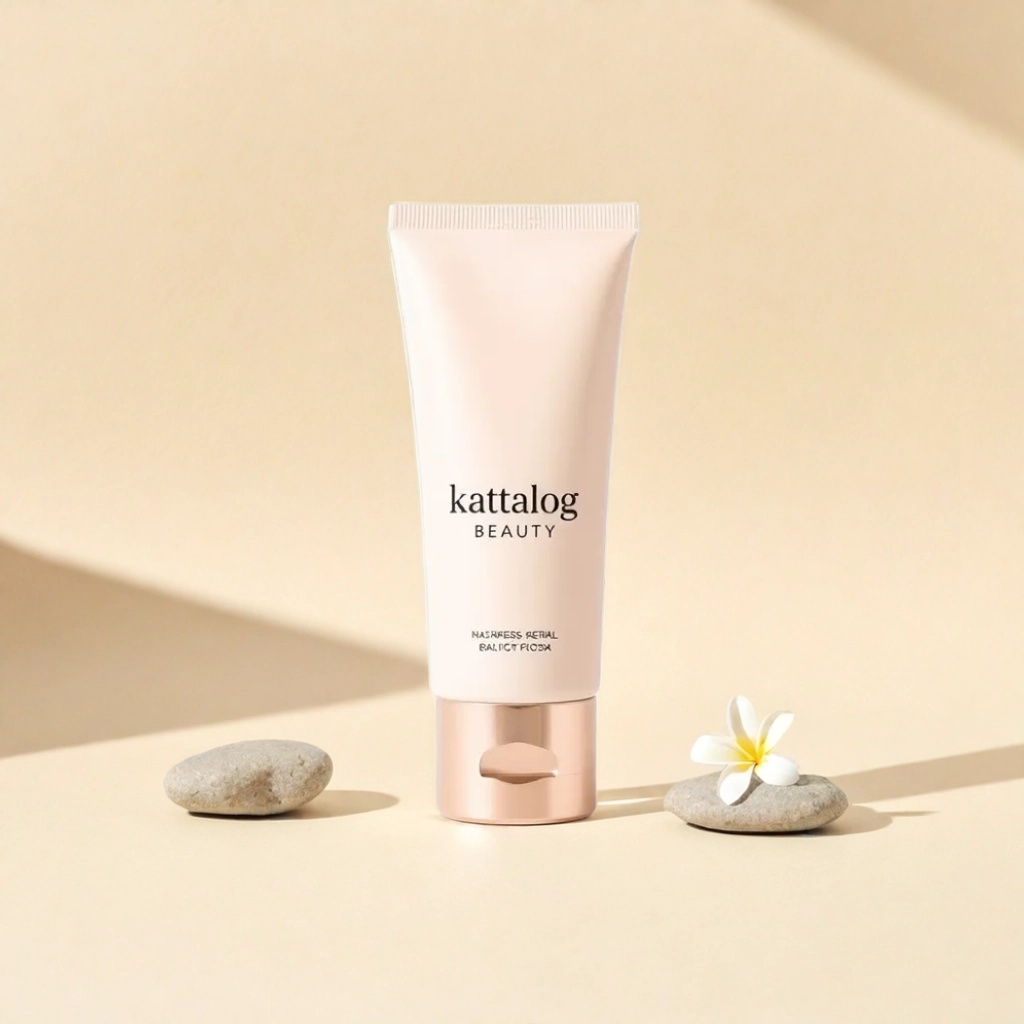 Kattalog Lotion on Beige background with stones and frangipani flowers