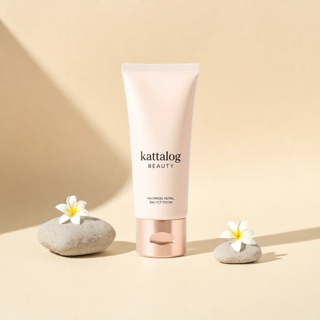 Kattalog Lotion on Beige background with stones and frangipani flowers. AI product photography examples generated by Kattalog AI.