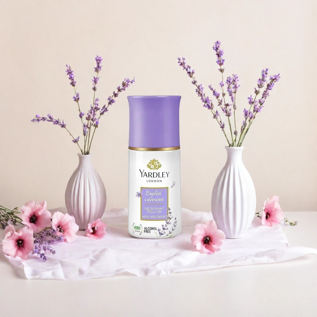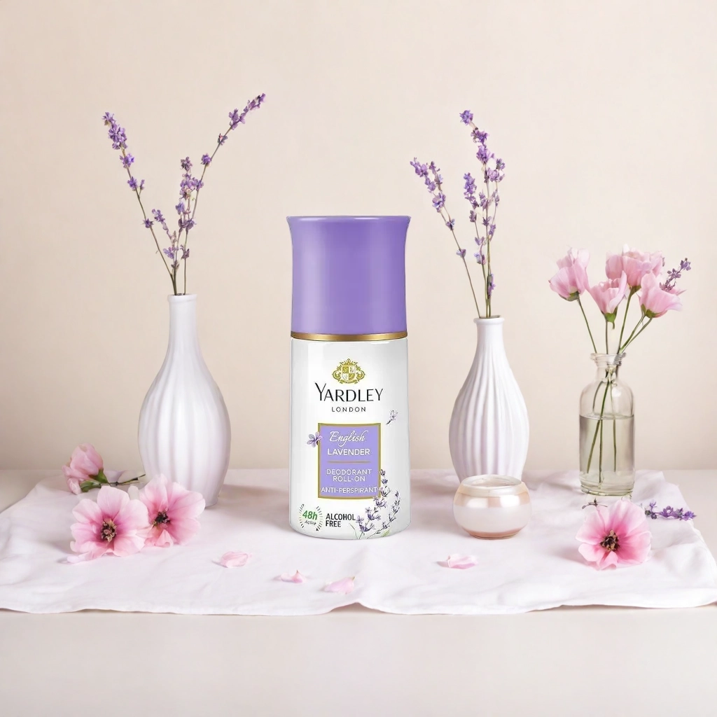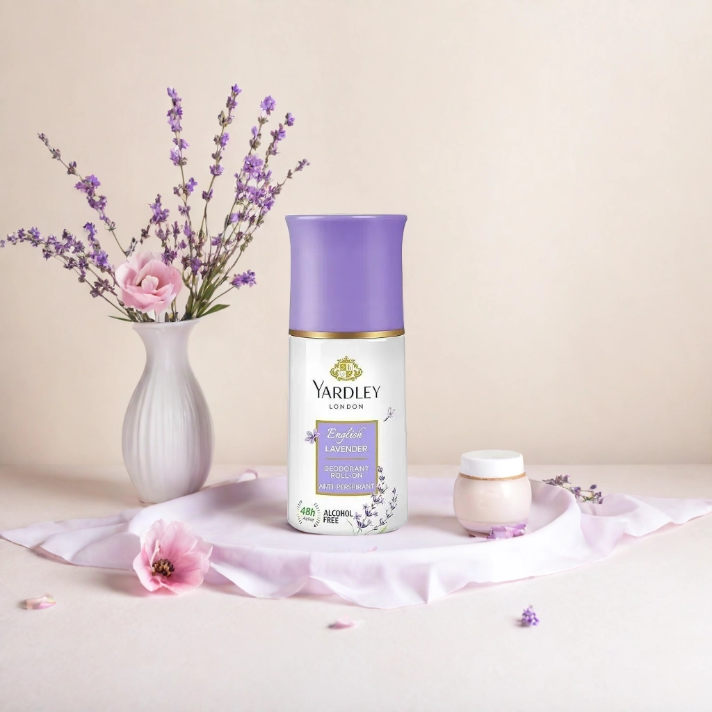 Yardley London Deodorant on Table Top with Accessories. AI product photography examples generated by Kattalog AI.The product images on this page are for demonstration purposes only. The brand shown is not affiliated with or endorsing this app